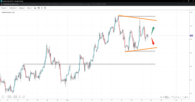 The price of London’s Gas failed to reach the previous top, and if it continues lower without sliding under the swing support of $953, we may see a triangle form. Lack of support may inspire short bets towards $930, whereas a rally past $1018 could clear the path to $1050.