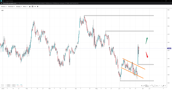 The stock price of GSK left a flag behind, clearing the path towards 1525p following a successful takeover of 1485p. If the gap at 1355p is fully reversed in the event of a slide under 1380p, the stock will be exposed to the regional low of 1330p.