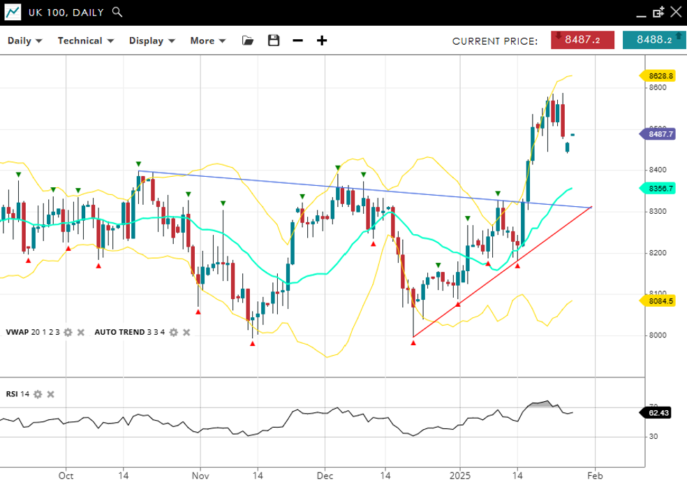 The UK 100 maintains its bullish impulsive momentum, trading at 8,487, comfortably above its VWAP (20) of 8,356 after the big rally. Support is defined at 8,084, and immediate resistance lies at 8,628. The RSI at 62 indicates sustained bullish momentum in the current trend.