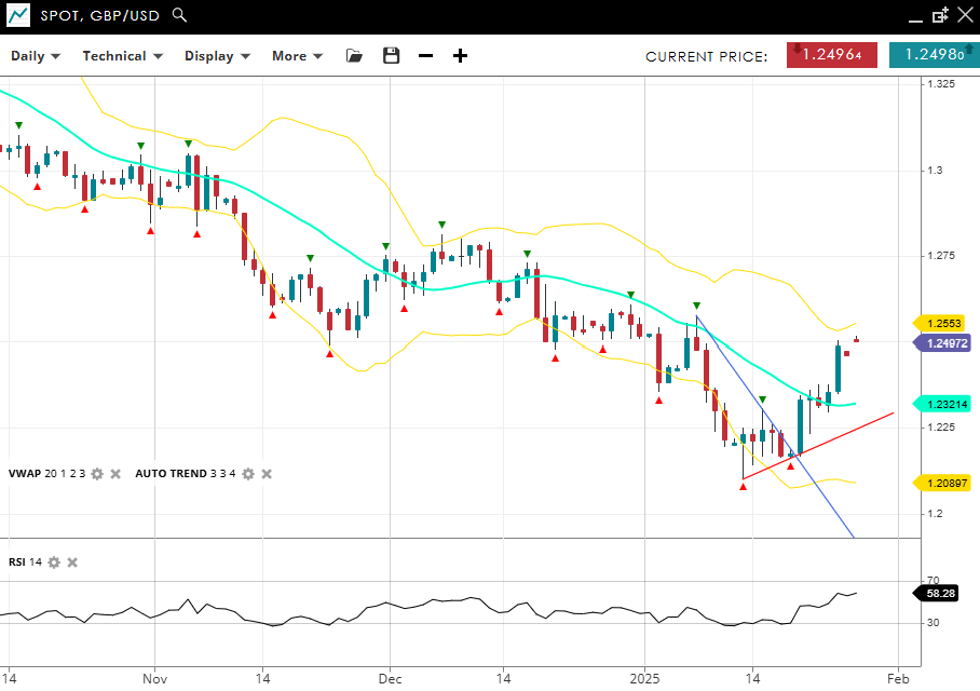 GBP/USD also stays within a bearish trend but enters a correction, trading at 1.2497, above its VWAP (20) of 1.2321. Support is established at 1.2089, while resistance is at 1.2553. With an RSI of 58, momentum is stabilising after previously being oversold.