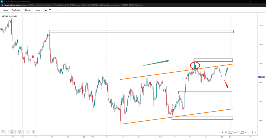 US Tech appears to be in a falling flag pattern, with the second peak at 12100 putting in a false break for now. Bears eye the lower channel trendline for a potential breakout, with 11200 being short-term support. 10600 is a crucial level below the trendline support.