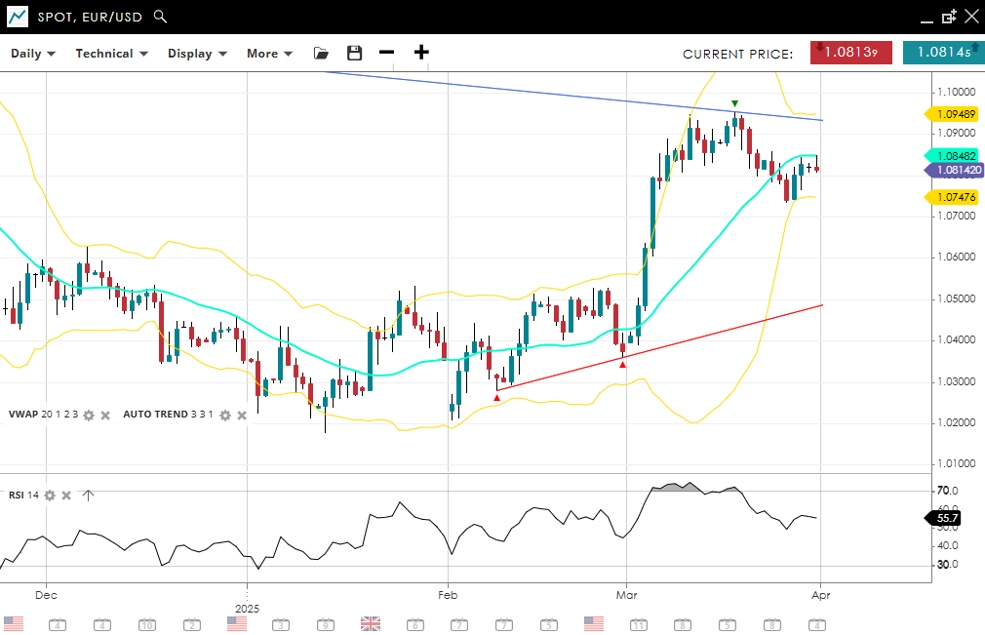 EUR/USD sustains its bullish setup as it undergoes a dip trading at 1.0814, marginally below the VWAP of 1.0848. The RSI at 55.7 leans constructive though lacks strong momentum. Near-term support is at 1.07476, while 1.09489 is the next resistance zone to watch for continuation.