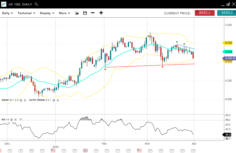UK 100 remains in a neutral, consolidative phase after stalling from earlier gains. It’s quoted at 8,553, just under its 20-day VWAP of 8,644. The RSI of 39.2 shows a loss of momentum, leaning slightly bearish. Key support is marked at 8,500, and only a break above 8,763 would signal fresh upward traction.