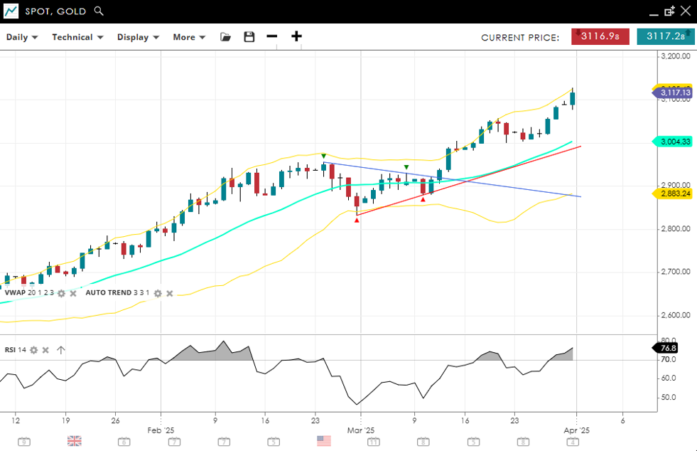 Gold continues to sprint into record highs, quoted at 3,117 and well above the 20-day VWAP of 3,004. The RSI at 76.8 is firmly in overbought territory, highlighting stretched momentum but also strength. While some pullback could occur, support is seen way back at 2,883, with the recent highs acting as near-term resistance before 3200.