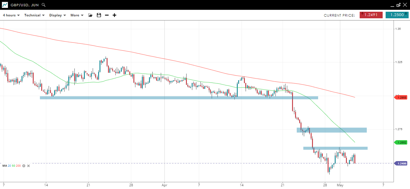 The downtrend has steadied above 1.25. A break over 1.26 could help establish a near-term low with 1.2750 the next resistance up. However the broader trend remains down - favouring sell trades - while price is below 1.30.