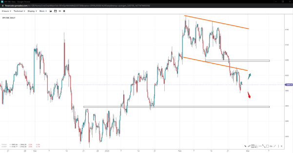 The UK 100 appears to have put in the right shoulder of a potential head-and-shoulders pattern at 7950. If 7850 fails to hold, it would confirm the pattern, and the index might see further losses to 7740. On the other hand, moving past the right shoulder might invalidate the H&S (or the right shoulder peak) after reclaiming the top.