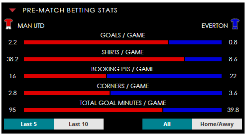 To see all the Man Utd v Everton betting stats and form, visit our pricing page to view our Pre-Match betting stats table or hover over/tap the chart image to see previous outcomes for that particular market.