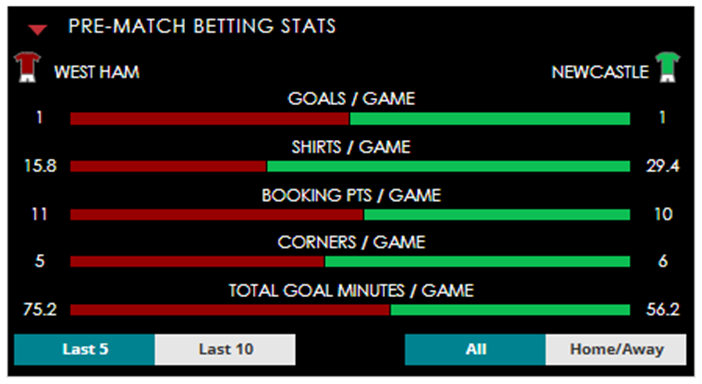 To see all the West Ham v Newcastle betting stats and form, visit our pricing page to view our Pre-Match betting stats table or hover over/tap the chart image to see previous outcomes for that particular market.